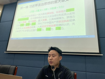 为了贯彻落实《教育部办公厅关于推进习近平法治思想纳入高校法治理论教学体系的通知》(教高厅函〔2021〕17号)、《法学类教学质量国家标准》(2021年版)等文件精神,法学院从2021-2022学年秋季学期开始,开设“习近平法治思想概论”课程。该课程为法学专业核心必修课程。为了讲好这门课,学院课程思政研究中心于2021年10月13日在文法楼123教室召开“习近平法治思想概论”专题备课会。法学院副院长彭中礼教授主持了集体备课会。