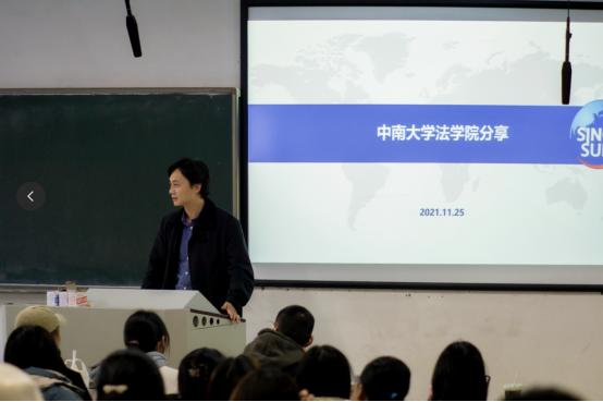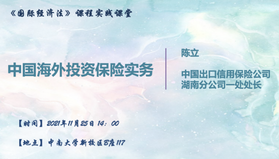 为加深同学们对《国际经济法》课程学习中“海外投资保险制度”的理解和认识,2021年11月25日下午两点,中南大学新校区B座117开展了一场生动的“中国海外投资保险实务”实践课。此次实践课由中南大学法学院邓婷婷副教授主持,中国出口信用保险公司湖南分公司一处处长陈立主讲,法学院1901、1902班全体同学共同参与。