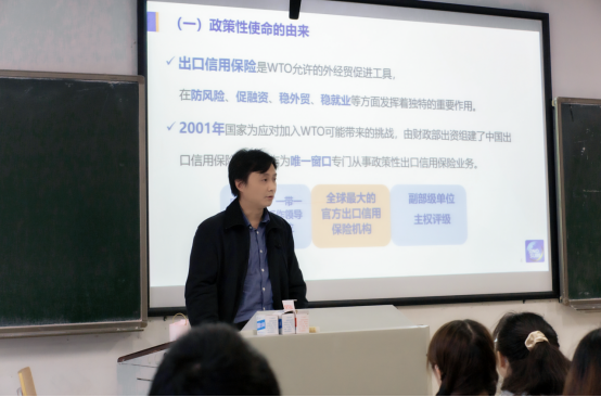 课程伊始,邓婷婷副教授首先带领同学们对海外投资保险制度相关知识进行简要回顾。在此基础上,陈立处长以我国承担海外投资保险的机构——中国出口信用保险公司(以下简称“中国信保”)的政策性使命为背景,结合中国信保保航企业“走出去”的具体实践对中国海外投资保险实务进行了全面的介绍。