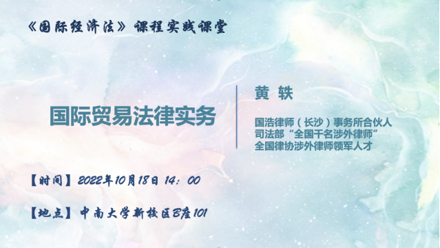 当今世界正经历百年未有之大变局,全球治理体系深刻重塑。随着综合国力的不断提高,我国日益走近世界舞台的中央。在应对大变局、参与全球治理、走向世界的过程中,我国亟需加强涉外法治建设,亟需一大批通晓国际法律规则、善于处理涉外法律事务的涉外法治专业人才,以保障和服务高水平的对外开放。为了进一步有效推进涉外法治人才培养,推动国际经济法理论与实践的深入融合,2022年10月18日下午两点,《国际经济法》课程实践课堂“国际贸易法律实务”在中南大学新校区B座101顺利开展。此次实践课堂由中南大学法学院副教授邓婷婷主持,国浩律师(长沙)事务所合伙人、司法部“全国千名涉外律师”、全国律协涉外律师领军人才黄轶律师主讲,法学2004、2005班全体同学共同参与。