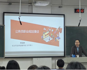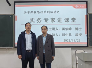 为进一步推进法学课程思政系列主题教育落实落细,11月22日,法学院在新校区进行“法学课程思政系列活动之实务专家进课堂”教学活动。长沙市法学会秘书长黄俊峰博士以“公务员职业规划漫谈”为题进行主讲,中南大学法学院副院长彭中礼教授主持。