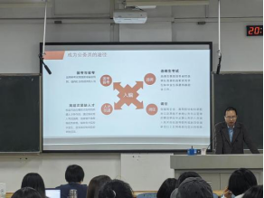 课程进行中,黄俊峰博士首先对公务员的概念、公务员的岗位分类、公务员的主要工作内容、公务员的优劣势、如何正确看待公务员这项职业等等问题进行介绍。其次结合法学专业与公务员,对法学专业的就业现状比如毕业生多、需求量有限、法学生考公务员的报考现状等问题进行探讨。最后黄俊峰博士就成为公务员的途径、公务员的招录流程、公务员的考试科目、参加公务员考试要做哪些准备等等问题进行分享。
