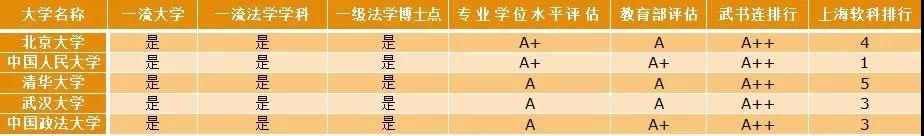 目前,在全国所有法学院校中,符合这一条件的只有中国人民大学、中国政法大学、武汉大学、北京大学、清华大学5所,当之无愧成为一线第一梯队。