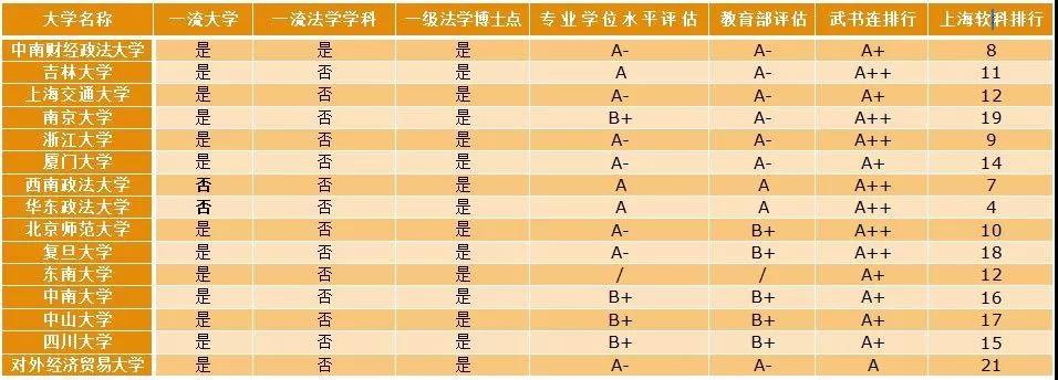 第一梯队的法学院校同时符合七大标准,即一流大学、一流学科、一级博士点、学位中心评估A级以上、教育部评估A级以上、武书连评价A级以上和上海软科前10%。