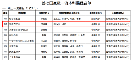 近期,教育部发布了《关于公布首批国家级一流本科课程认定结果的通知》(教高函〔2020〕8号),中南大学何炼红教授负责的《知识产权法》线上课程入选首批国家级一流本科课程。