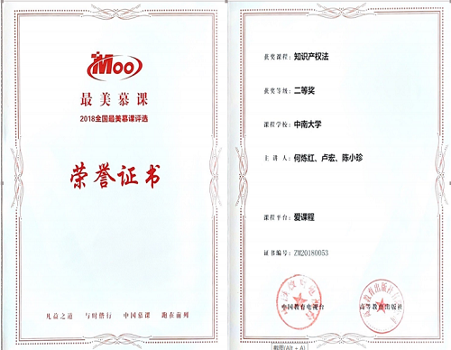 自2018年2月《知识产权法》课程在中国大学mooc平台首次上线至今,已经开课7次,参与学习人数累计达三万五千余人次。课程于2018年11月在“首届中国大学慕课精彩100评选展播活动”中脱颖而出,荣获中国“最美慕课”。