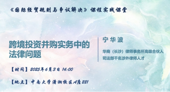 为加强以实践为导向的涉外法治人才培养,中南大学法学院邓婷婷副教授主讲的《国际经贸规则与争议解决》课程引入由实务专家授课的实践课堂。2025年6月3日下午,该课程的第三次实践课堂在中南大学潇湘校区A座221教室顺利开展。华商(长沙)律师事务所高级合伙人宁华波律师以“跨境投资并购实务中的法律问题”为主题,为法学院T2201班同学带来了一堂生动的实务课。