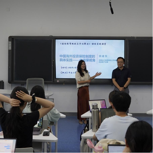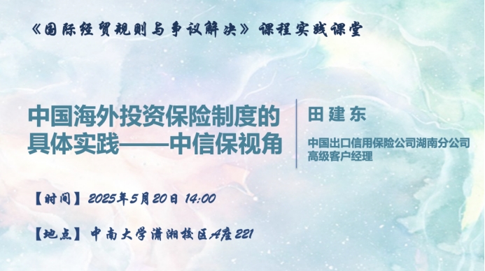 为加强以实践为导向的涉外法治人才培养,中南大学法学院邓婷婷副教授主讲的《国际经贸规则与争议解决》课程引入由实务专家授课的实践课堂。2025年5月20日下午,该课程的第二次实践课堂在中南大学潇湘校区A座221教室顺利开展。中国出口信用保险公司(以下简称中国信保)高级业务经理田建东以“中国海外投资保险制度的具体实践——中国信保视角”为主题为法学院T2201班同学进行授课。