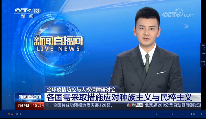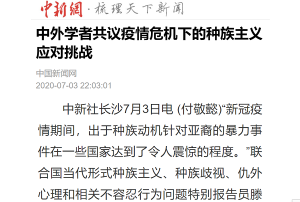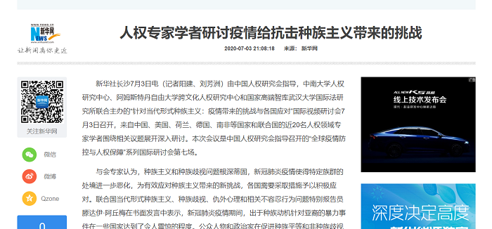 7月3日,由中国人权研究会指导,中南大学人权研究中心、阿姆斯特丹自由大学跨文化人权研究中心和国家高端智库武汉大学国际法研究所联合主办的“针对当代形式种族主义:疫情带来的挑战与各国应对”国际视频研讨会顺利召开,来自中国、美国、荷兰、德国、南非等国家和联合国的近20名人权领域专家学者围绕相关议题展开深入研讨。本次会议是中国人权研究会指导召开的“全球疫情防控与人权保障”系列国际研讨会第七场,得到了中国新闻网、新华网、央视新闻直播间和央视国际电视台(CGTN)等多家中央媒体广泛深入报道。