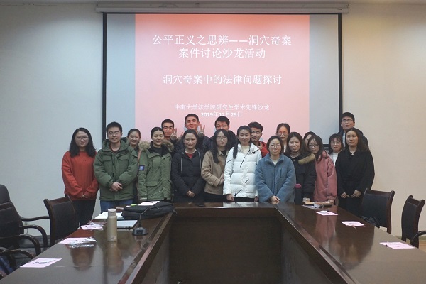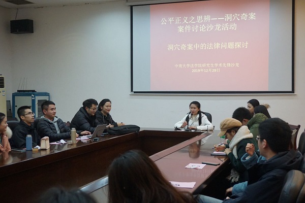2019年12月29日19点,由中南大学法学院承办,中南大学法学院19级研究生张跃梦、王雨溪、王琳、黄森楠、袁达共同申办的学术先锋沙龙活动在文法楼210案例研讨室顺利举行。中南大学法学院本科生、硕士生、博士生参与了此次沙龙活动。本次学术先锋沙龙活动的主题是“公平正义之思辨——洞穴奇案案件讨论沙龙活动”。旨在通过同学们共同探讨由“洞穴奇案”所引出的公平正义问题,普及基础法律知识,包容观点碰撞,求同存异,开拓思维,在研究讨论的过程中相互学习与提升。