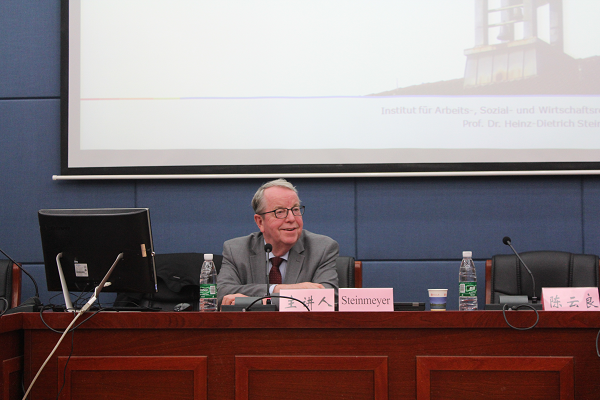 邵华副教授对施坦因迈耶教授的到来表示感谢,并对其作了简短介绍。施坦因迈耶教授从事法律教育研究三十余年,长期从事劳动法、社会保障法的教学与研究,颇有心得,著述丰富,先后发表著作论文上百篇,是德国著名劳动法与社会保障法学家,德国明斯特大学法学院教授。其曾先后担任德国哈根大学、明斯特大学等法学院院长、明斯特大学法学院劳动法、社会保障法和经济法研究所所长等职务,并多次受邀作为专家组成员参加欧盟和德国劳动法和社会保障领域的立法及相关工作。现任欧洲网络补充养老金研究学会主席。教授还长期关注中国社会保障法的发展和实施,曾由德国政府委派作为德方专家参与中德社会保障法法律研讨活动。