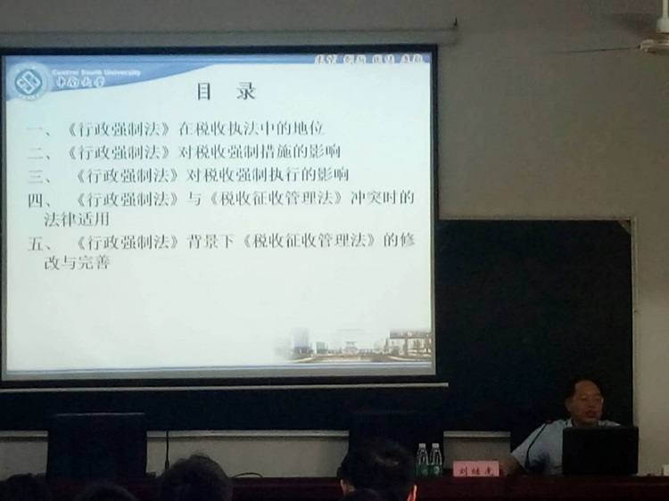5月27日下午,中南大学法学院副院长、湖南省法学会财税法学研究会会长刘继虎在中南大学继续教育学院为湖南省国家税务局公职律师和法律顾问履职能力提升培训班学员进行《行政强制法对税收执法的影响》专题讲座。