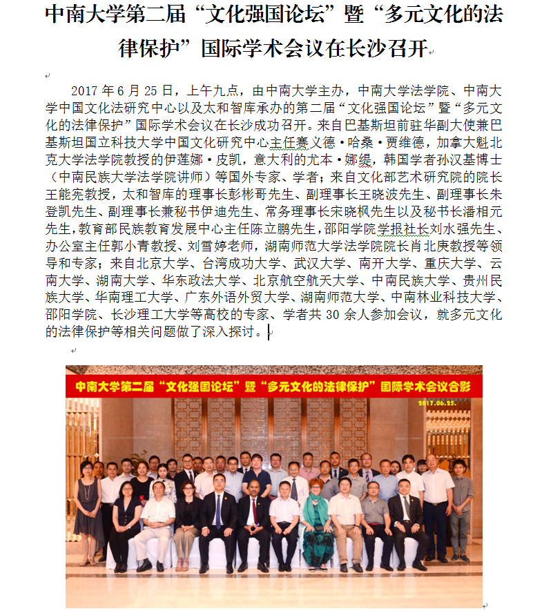 中南大学第二届“文化强国论坛”暨“多元文化的法律保护”国际学术会议在长沙召开