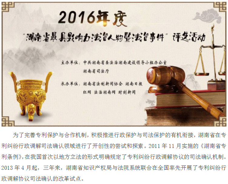 (此次2016年度“湖南省最具影响力法治事件”活动,中南大学知识产权研究院顺利入围评选环节,该项成果为研究院与湖南省知识产权局、岳麓区人民法院的力作,每天可投一次,截至5月5号,敬请大家关注和支持!)