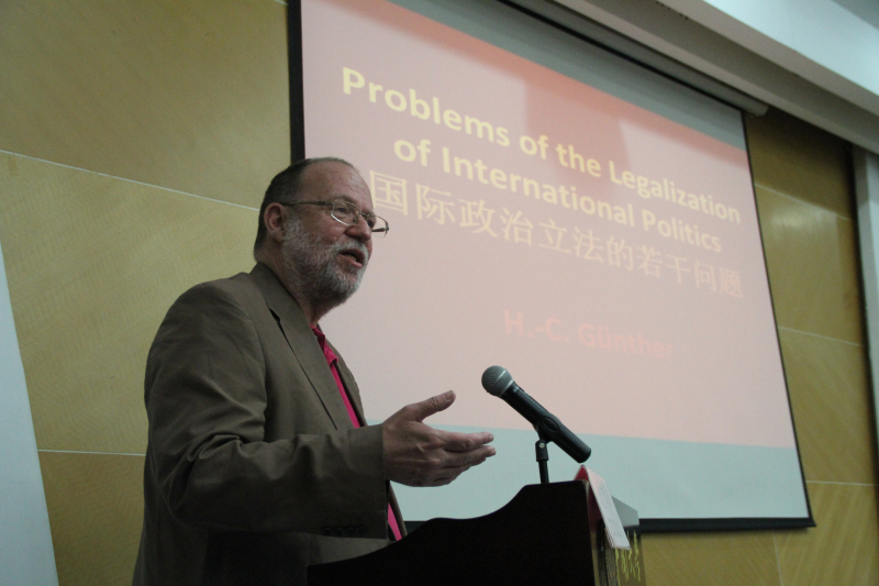 开幕式后,主题研讨正式开始。第一专题围绕“国际政治与国际法”展开。首先,德国弗莱堡大学的H.C. Gunther教授针对国际政治立法的若干问题进行发言。他谈到了联合国安理会的权力、中国、美国、俄罗斯之间的政治问题,指出今后中美俄将会成为地球村的主要代表国家。