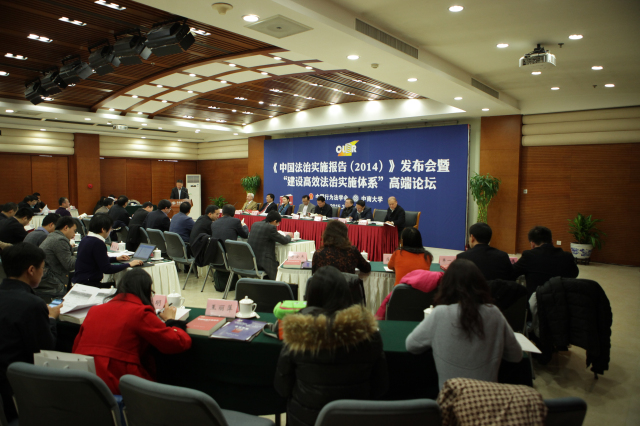 旨在记录中国法治的发展历程,为法治中国实践提供系统的“年度体检”,中国行为法学会和中南大学法学院联合主办的《中国法治实施报告(CLER)2014》2015年3月1日上午在北京中国科技会堂发布。第十二届全国人大法律委员会副主任委员苏泽林,国务院法制办副主任甘藏春,中国行为法学会会长江必新,最高人民法院副院长贺荣,中国法学会党组成员、副会长、学术委员会主任张文显,中信集团监事长朱小黄,中南大学常务副校长黄健柏等领导,以及来自北京大学、中国社会科学院、中国政法大学、对外经贸大学等高校的法学学者,中共中央办公厅、最高人民法院、最高人民检察院等实施机构的实务专家等50余人莅临会议。《人民日报》、《光明日报》、《法制日报》、《检察日报》、《人民法院报》以及《新华文摘》、《改革内参》、《人民法治》、法律出版社、人民出版社、人民法院出版社等多家新闻和出版单位共襄盛举。
