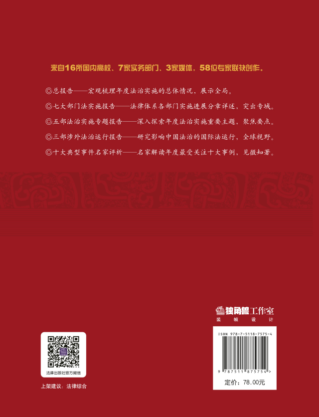 中国法治实施报告(CLER)项目已经进入到第二年。今年,项目吸纳了主办方中南大学和来自北京大学、清华大学、中国人民大学、中国社会科学研究院等 16 所国内著名高校,最高人民法院、最高人民检察院、中共中央办公厅等 7 家实务部门,以及《人民日报》、《改革内参》、中国法学会研究部 3 家媒体,共计 58 位专家实质性参与了报告写作。总报告,宏观梳理年度法治实施的总体情况,展示全局;七大部门法实施报告,对法律体系各部门实施进展分章详述,突出专域;五部法治实施专题报告,深入探索了年度法治实施重要主题,聚焦重点;三部涉外法治运行报告,研究影响中国法治的国际法运行,展示全球视野;十大典型事件名家评析,邀请国内顶尖专家解读最受关注的年度实施事件,见微知著。