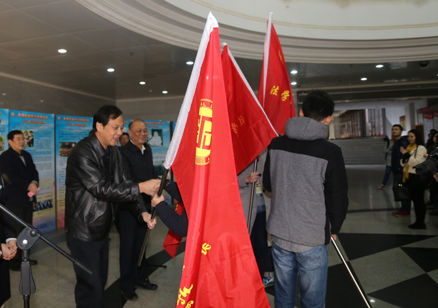本次启动仪式由法学院党委书记王新平主持。随后,高文兵书记致辞,希望老师同学们能通过这次活动,增强宪法知识,培养法治精神。在党带领全国人民共同实现“法治梦·中国梦”的新征程中,谱写中南大学改革、发展、建设、提高的新篇章,为建设世界知名高水平大学而努力奋斗,并宣布“中南大学‘法治梦·中国梦’系列主题活动正式启动。”紧接着,中南大学常务副校长黄健柏、党委副书记高山为法学院志愿者代表进行了授旗,为此次的启动仪式划上圆满句号。