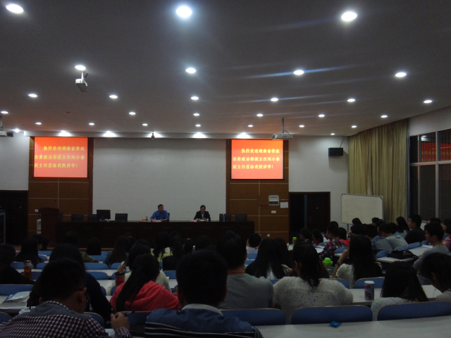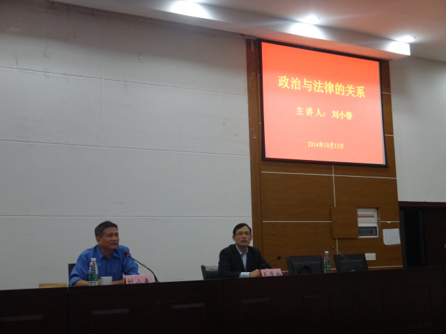 2014年10月15日晚上,湖南省委政法委政治部副主任刘小春应邀前来我院实验法庭作了题为“政治与法律的关系”的学术报告。报告会由法学院副院长毛俊响副教授主持。法学院院长陈云良教授及部分师生参加了此次报告会。