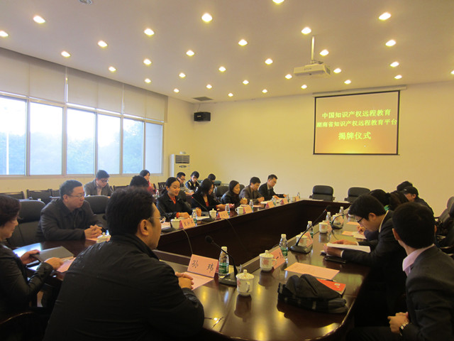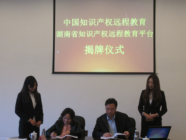 在热烈的气氛中,中国知识产权培训中心孙玮副主任与湖南省知识产权局刘跃红副局长共同签署了知识产权远程教育推广合作协议,为“湖南省知识产权远程教育子平台”授牌。