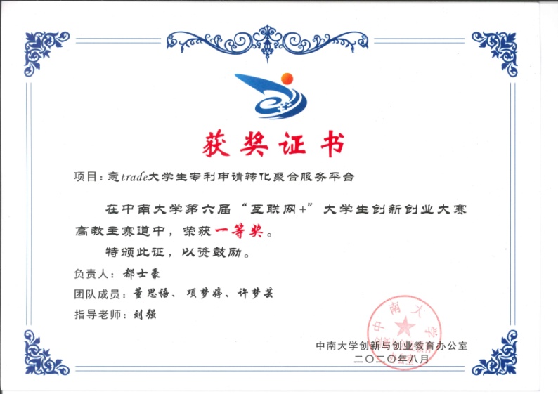 刘强教授指导学生团队完成的“意trade大学生专利申请转化聚合服务平台”项目在中南大学第六届“互联网+”大学生创新创业大赛高教主赛道中荣获一等奖。团队负责人为都士豪(土木工程学院2018级本科生),团队成员为董思语(商学院2019级本科生)、项梦婷(文学与新闻传播学院2018级本科生)和许梦芸(法学院2018级本科生)。