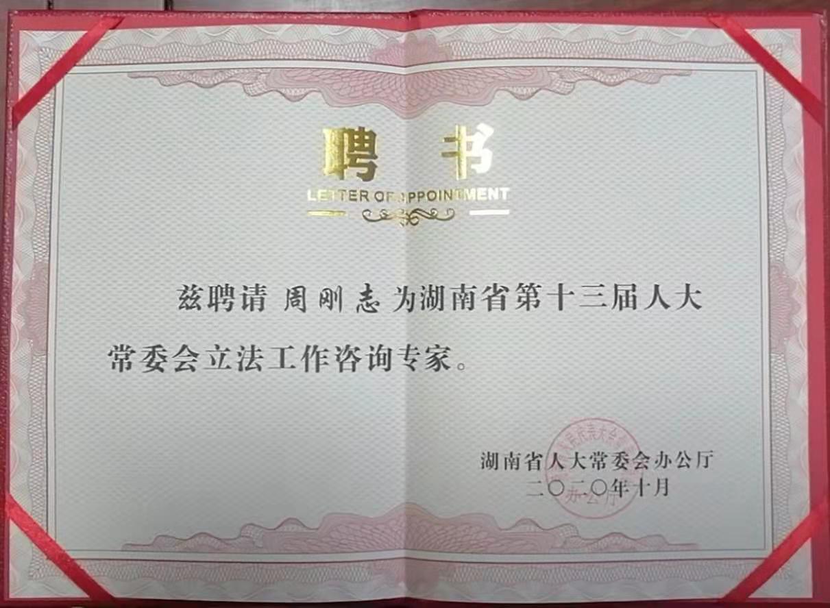 周刚志教授当选为湖南省人大常委会立法工作咨询专家并由王柯敏副主任亲自颁发聘书,体现了湖南省人大领导对于周刚志教授及中南大学中国文化法研究中心团队工作成绩的充分肯定。周刚志教授向湖南省人大领导深致谢意,并表示将继续努力,竭诚为我省立法工作提供咨询服务。