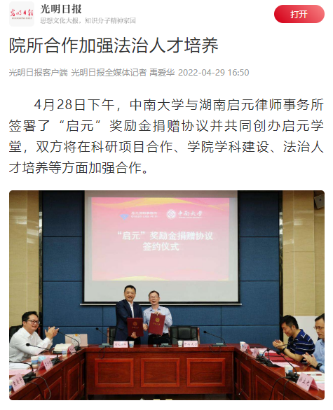 4月28日下午,中南大学与湖南启元律师事务所签署了“启元”奖励金捐赠协议并共同创办启元学堂,双方将在科研项目合作、学院学科建设、法治人才培养等方面加强合作。