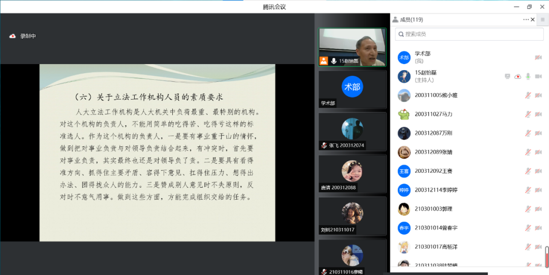 2022年5月27日晚上7点,长沙市人大法制委原主任委员、常委会法工委原主任周伟在中南大学法学院123会议室开展了以“地方立法理论与实务”为主题的讲座,该讲座在腾讯会议平台同步直播。本次讲座由中南大学法学院副院长杨清望教授主持,副院长敖双红教授、唐东楚教授、蒋清华副教授、李沫副教授、程能博士等参加本次讲座,线上线下共有170余名师生参与。