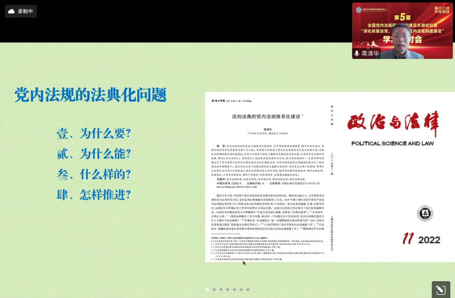 2022年11月26—27日,在全国上下深入学习贯彻党的二十大精神的背景下,第五届全国党内法规研究机构建设东湖论坛暨“深化依规治党、深入推进党内法规制度建设”学术研讨会以线上方式成功举办,并开放直播。开幕式上,湖北省委常委、秘书长陈新武,武汉大学党委书记韩进,中共中央办公厅法规局副局长张禹先后视频致辞,武汉大学党委常委、副校长、党内法规研究中心主任周叶中主持。大会发言阶段,我院党内法规研究中心主任蒋清华副教授作为7位报告人之一,作了题为“迈向法典的党内法规体系化建设”的学术演讲。
