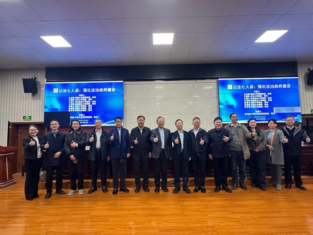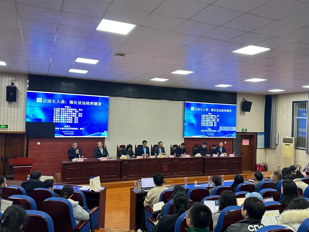 2025年12月28日下午,“公法七人谈:强化法治政府建设”高端学术讲座在法学院221报告厅隆重举行。来自湖南大学的江必新(兼职)教授、北京大学的王锡锌教授、西北政法大学的王周户教授、西南政法大学的王学辉教授、吉林大学的彭贵才教授、东南大学的杨登峰教授、深圳大学的邹平学教授七位公法学界著名学者齐聚一堂,围绕新时代法治政府建设的核心议题,展开深度对话与思想碰撞。
