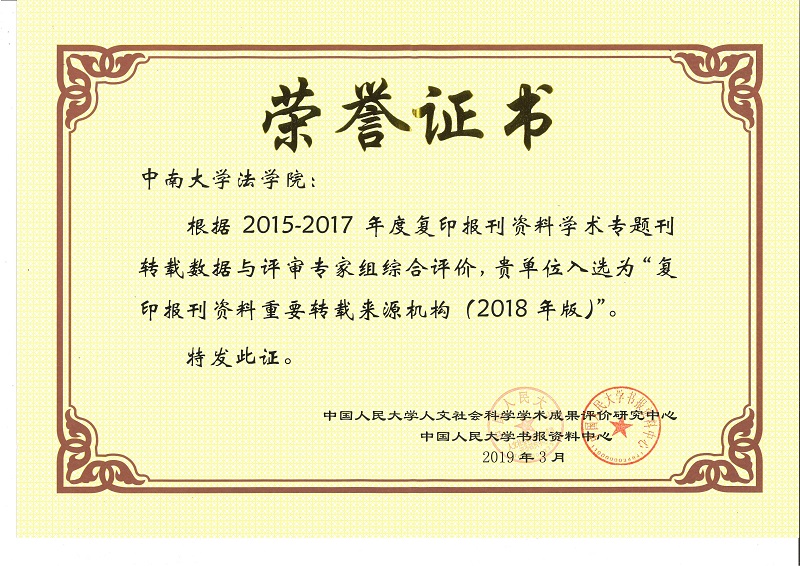 2019年3月,根据2015年——2017年度复印报刊资料学术专题刊载数据与评审专家组综合评价,中南大学法学院入选为“复印报刊资料重要转载来源机构(2018年版)”。此项成果由中国人民大学人文社会科学学术成果评价研究中心和中国人民大学书报资料中心联合发布。