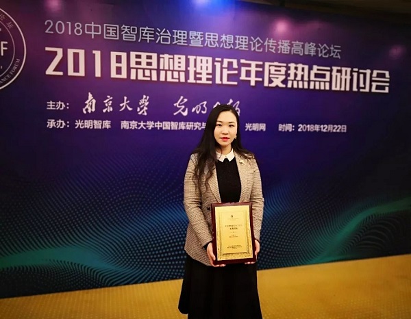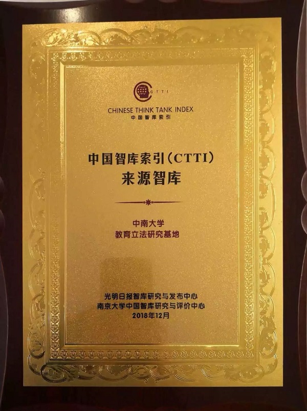 2018年12月22日,由南京大学和光明日报共同举办的2018中国智库治理暨思想理论传播高峰论坛在南京钟山宾馆隆重举行。会议发布了2018CTTI来源智库增补名录,中南大学教育立法研究基地成功入选;基地执行主任、博士生导师徐靖副教授应邀参加本次论坛,并获颁入选证书。