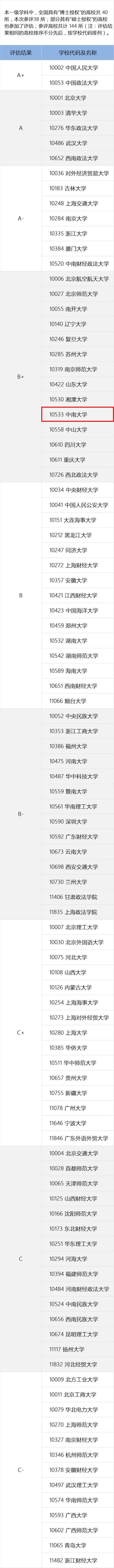 在法学一级学科中,全国具有“博士授权”的高校共40所,本次参评38所;部分具有“硕士授权”的高校也参加了评估;参评高校共计144所。我院法学一级学科在参评单位中位居前20%,全国排名并列第15名。从榜上无名到直接进入B+行列,近年来全院师生共同努力,筚路蓝缕启山林,栉风沐雨砥砺行,取得了辉煌成就。