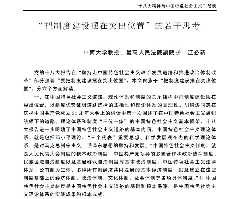 江必新教授在《中国社会科学》上发表《“把制度建设摆在突出位置”的若干思考》一文