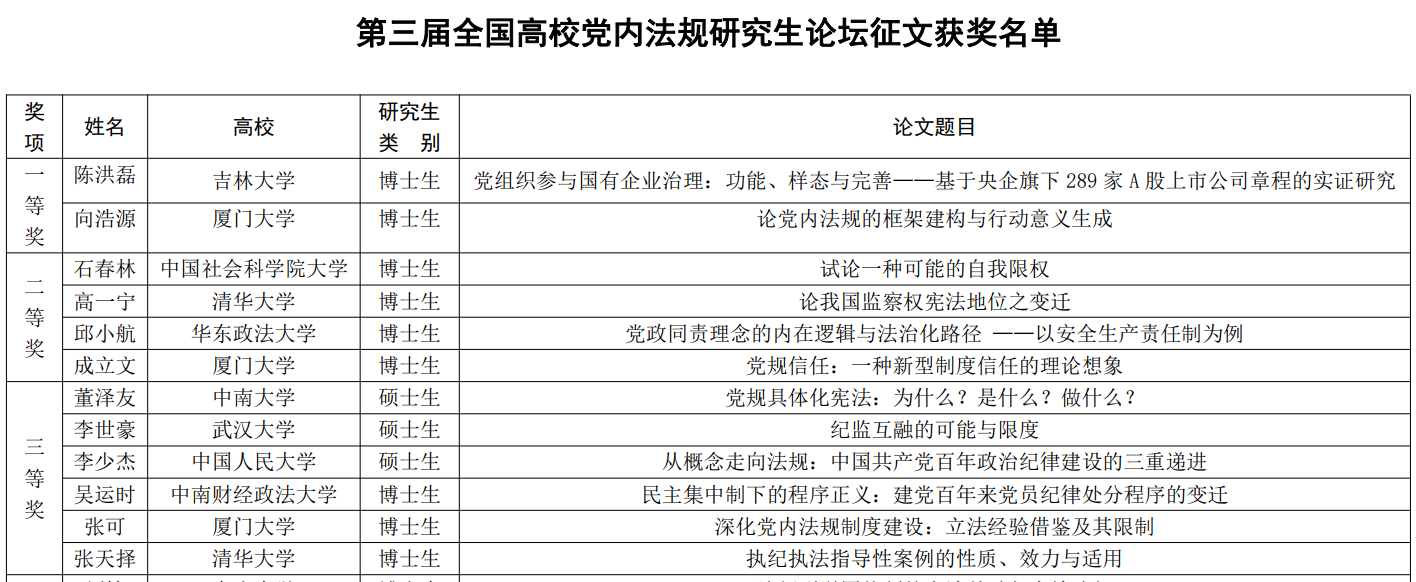 “第三届全国高校党内法规研究生论坛”近日成功举办,获奖名单已揭晓,我院蒋清华老师指导的2019级法律硕士专业学位研究生董泽友同学受邀作论文报告,并获征文三等奖。
