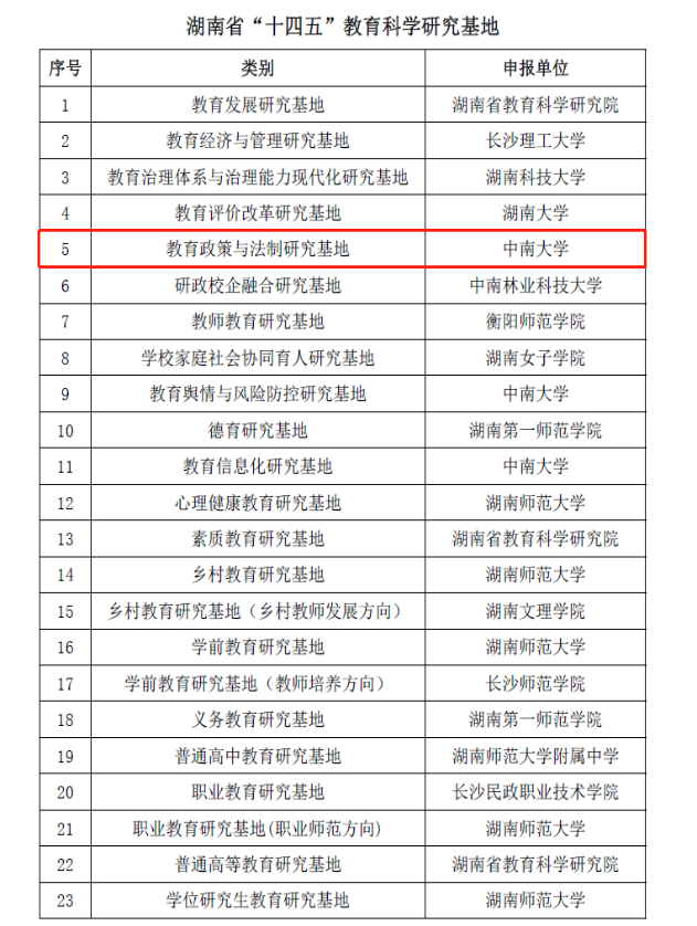 近日,湖南省教育科学领导规划小组发布《关于公布湖南省“十四五”教育科学研究基地和重点培育基地的通知》(湘教科规通〔2022〕2号),中南大学教育政策与法制研究基地成功获批湖南省“十四五”教育科学研究基地。基地负责人为中南大学党委副书记蒋建湘教授,基地首席专家为中南大学法学院徐靖教授。