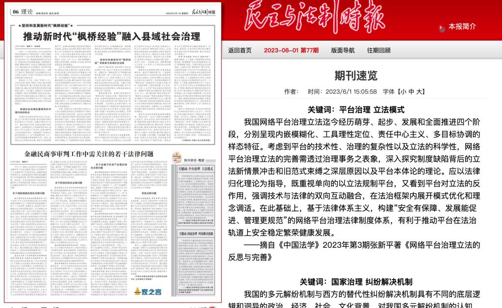近日,中南大学人权研究中心研究员、法学院副教授张新平在《中国法学》2023年第3期发表题为《网络平台治理立法的反思与完善》的文章。本文一经刊出,即被各大网站和《民主与法制时报》重点推介。