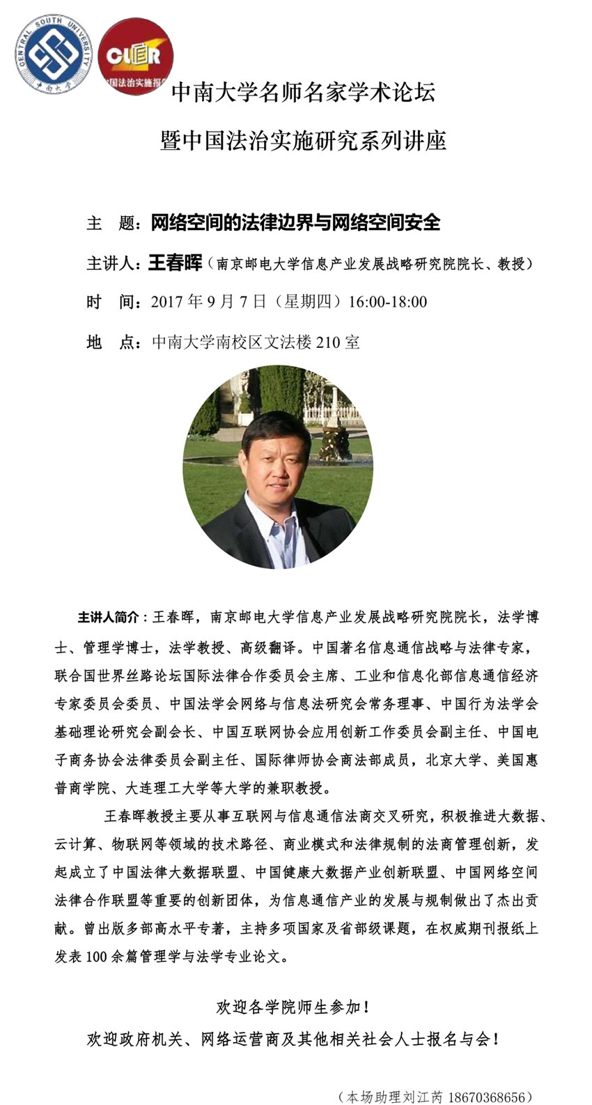 【中南大学名师名家学术论坛】王春晖:网络空间的法律边界与网络空间安全