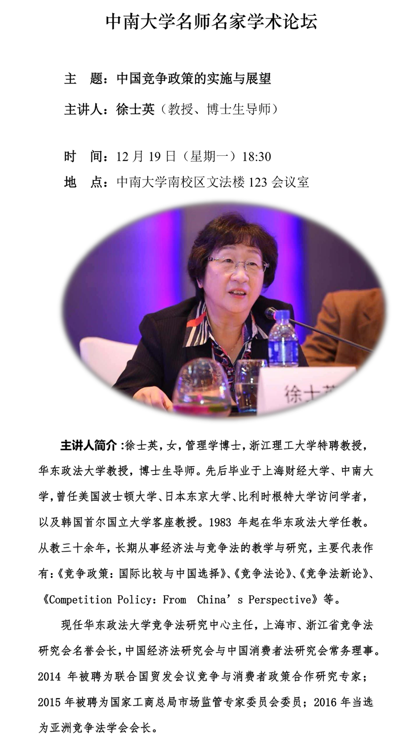 【更新】【中南大学名师名家学术论坛】徐士英:中国竞争政策的实施与展望