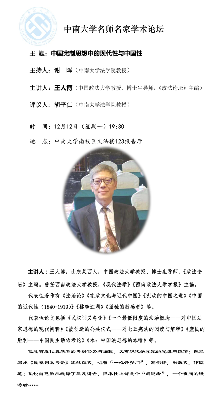【中南大学名师名家学术论坛】王人博:中国宪制思想中的现代性与中国性