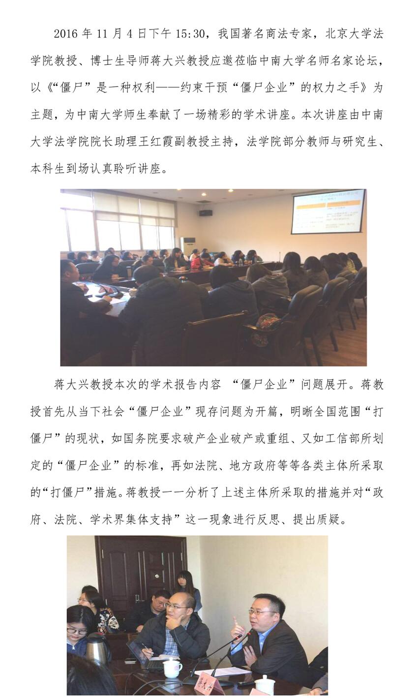 蒋大兴教授做客中南大学名师名家讲坛 畅谈约束干预“僵尸企业”的权力之手