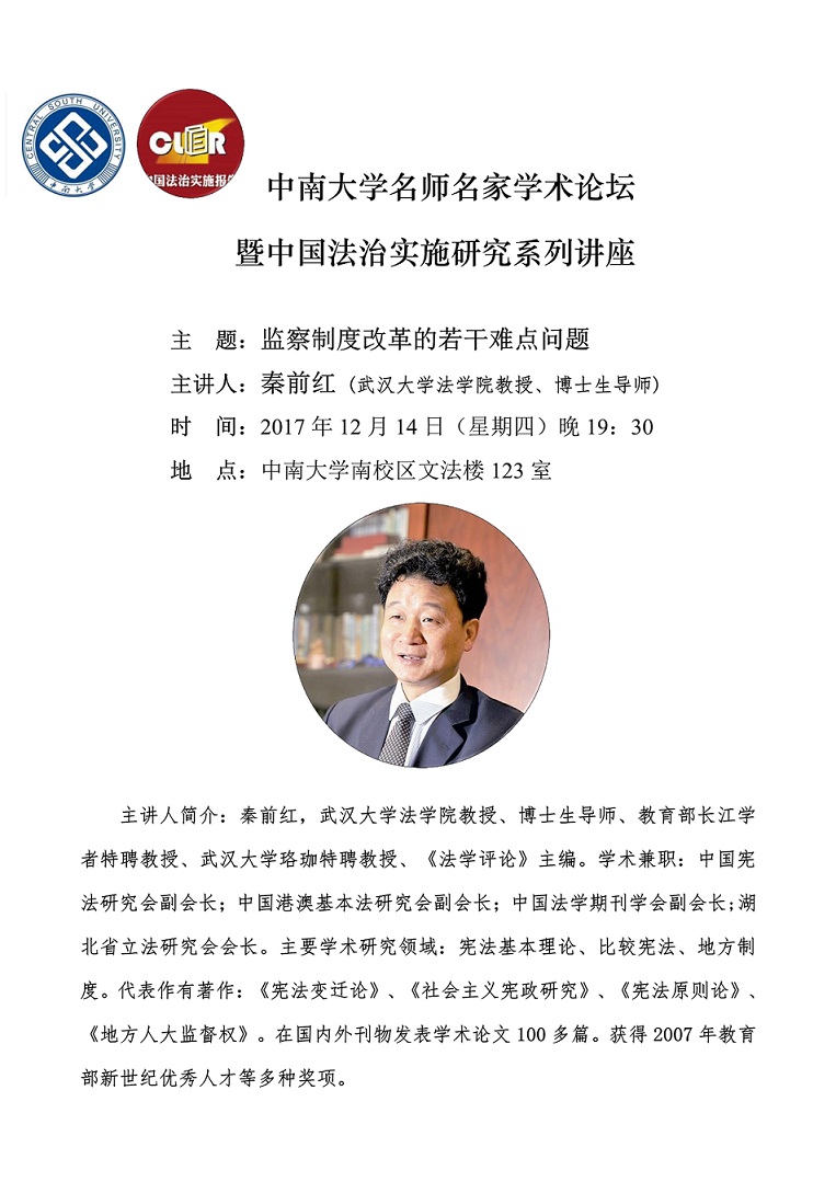 【中南大学名师名家学术论坛】秦前红:监察制度改革的若干难点问题