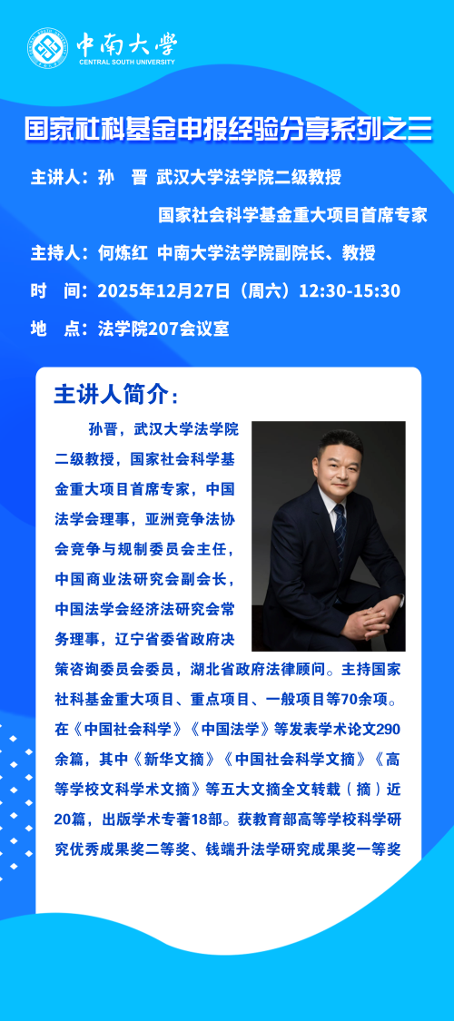 【讲座预告】孙晋:国家社科基金申报经验分享系列之三