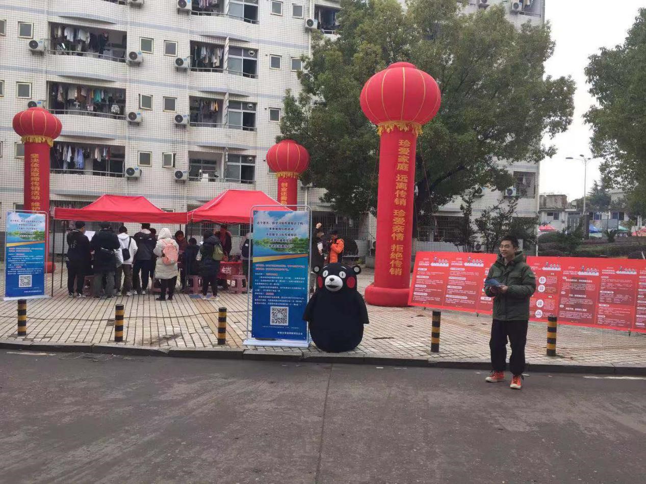 为提高我校大学生的反传销意识和能力,中南大学法学院研究生会联合岳麓区街道办以“远离传销,净化校园”为主题,于12月20日中午在南校区升华广场举行了反传销宣传教育活动,我校有数百名学生积极参与了本次活动。