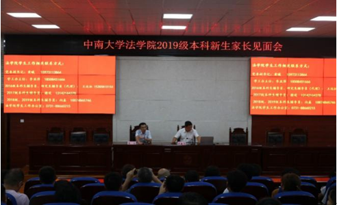 2019年8月30日下午4:30,中南大学法学院2019级本科新生家长见面会于法学院221报告厅召开。法学院党委王新平书记、党委黄曦副书记、团委书记谢琰老师、2019级本科新生辅导员向鑫老师与百余名家长共同参加了此次会议。