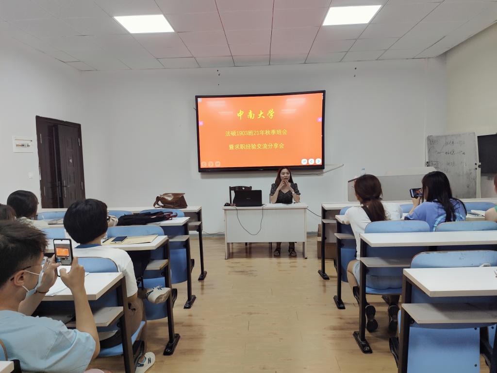 2021年9月15日晚,法硕1903班在法学院402举行了“求职经验交流分享会”,会议采取“线上线下相结合”的模式。湖南省2021届优秀毕业生潘亮、1903班王之宇和陈汝婷同学应邀做求职经验分享,1903班全体同学及法学院其他班数十名应届毕业生到场聆听。