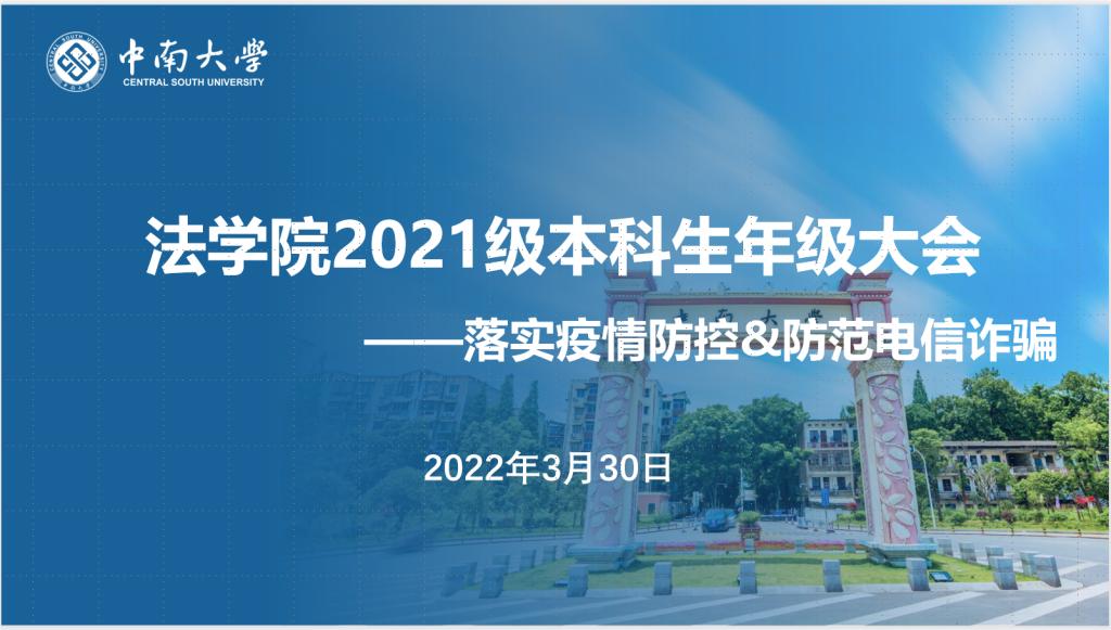 为响应学校号召,落实好疫情防控工作,同时引导学生树立正确的安全观,增强防范网络电信诈骗意识和能力,法学院2021级本科生年级大会于2022年3月30日14:00顺利召开。受疫情影响,本次大会在线上举行,参加本次会议的有法学院党委副书记黄曦老师、21级辅导员黎梦老师和21级全体同学。大会由辅导员黎梦老师主持,主要围绕疫情防控、防范电信诈骗两个方面展开。