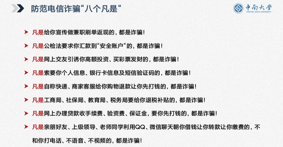黎梦老师向大家介绍了我校及周边地区的疫情态势,叮嘱大家非必要不出校,并按时按次参与核酸检测。提醒所有同学疫情期间务必做到“健康打卡百分百真实,外出百分百佩戴口罩,跨校区百分百两点一线”等,从严从紧落实疫情防控各项举措。就防范电信诈骗方面,黎梦老师组织同学们阅读并熟记防范电信诈骗的“八个凡是”,叮嘱大家务必擦亮双眼,三思而行,遇到类似诈骗的行为要第一时间报警处理。