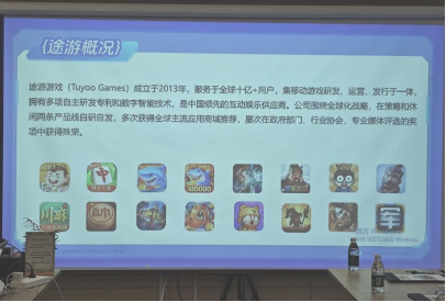 座谈会伊始,为帮助同学们更快了解游戏行业发展前景及途游公司整体情况,途游游戏的讲解员陈进从多维度为师生们系统梳理了公司的发展脉络与核心业务,让大家对途游有了全面认知。