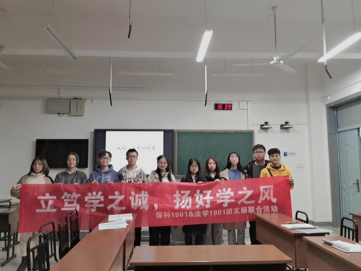 临近期末,各种考试如期而至。借此机会信科1901和法学院1901团支部联合开展以“立笃学之诚,扬好学之风”为主题的团日活动,以此鼓励同学们弘扬学术正气,独立地思考和解决问题,杜绝考试作弊。本次团日活动从12月16日到12月25日历时10天,信科1901班和法学1901班全体同学参加活动。